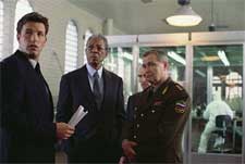 of All Fears, I Standing well above 6 feet tall, dressed in a blazer and sporting a diamond earring and an exquisite black pearl, Mr. Freeman arrived and held court. Naturally, with the current state of affairs in the world, The Sum of All Fears is a serious piece of work addressing many issues that are affecting our everyday life. When asked about how we should understand the terrorist state of affairs, Morgan explained in simple terms. “I am not worrying. Individually our lives have changed. And our proposed or supposed encounters of disaster are the same as being struck by lightning. I heard a broadcast saying that every morning when you drive to work, a certain number of motorists will be killed everyday. So does that mean you don’t go to work? Of course not, you take that risk everyday. If the people that are charged with telling and informing us that these things can happen, then it is up to each of us as individuals to be aware of what’s going on around us. Keep your eyes open. If you see a suspicious box or something, tell somebody. Maybe we have to get more proactive, but I don’t think we need to run scared.” Morgan’s character, Bill Cabbot, is the head of the CIA. In order to