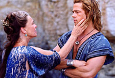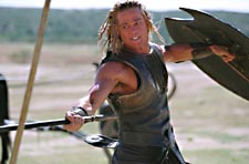 Hollywood's version of The Iliad bears a passing resemblance to Homer's epic poem. Wolfgang Petersen (the director) and David Benioff (the screenwriter) adapt the characters and storyline to fit the spectacle of a summer popcorn film. Usually the results are disastrous, but Troy succeeds as tremendous entertainment. It moves breezily along, passing the time with one battle scene after another. The CGI and wooden dialogue come dangerously close to diminishing the film, but the positive aspects far outweigh the negative. Troy will surely be a hit with audiences and march to box office glory this weekend. Helen (Diane Kruger) falls in love with Paris (Orlando Bloom), the youngest Prince of Troy. He steals her away from Menelaus (Brendan Gleesen) and takes her back to Troy, much to the dismay of his elder brother Hector (Eric Bana). Menelaus is filled with rage. He asks his older brother, Agamemnon (Brian Cox), to use the Greek army to force her return. Agamemnon is a cruel and power hungry man. He has ruthlessly conquered all of the city-states in the Aegean Sea except for Troy. He sees an opportunity to start a war and bring Troy under his control. Achilles (Brad Pitt) is the greatest warrior that has ever lived. He despises Agamemnon, but thirsts for battle and the fame it carries. He's convinced by Odysseus (Sean Bean), the King of Ithaca and close friend, to lead the Greek army against the Trojans. The three main characters and the actors that portray them carry the film. Brad Pitt is an arrogant, deadly Adonis as Achilles. His physique is really something to be admired. The guy is etched out stone and plays it for all it's worth in his most vainglorious role yet. Tyler Durden, Brad Pitt's memorable character from Fight Club, looks like he's been eating Twinkies all day when compared to Achilles. Who utterly owns the battlefield and spends the movie eviscerating enemies in every way. Achilles has this awesome power move that he uses to stab his opponents. Wolfgang Petersen uses slow motion to add its effectiveness. It really works, the Achilles fight scenes are incredible to see. While the film overuses CGI FX for epic battle scenes, the man-to-man combat scenes are brilliantly choreographed and shot. The camera loves Brad Pitt's physical presence in every film he does. What makes him a good actor is that he always backs it up with the performance. Achilles falls in love with Briseis (Rose Byrne), the captured cousin of Hector. Their relationship is contrived, but it works in portraying Achilles as multi-dimensional. He has the ability to love and put down his sword. Erica Bana owns this movie as Hector. He has the best-written character and maximizes the character's potential on screen. It's the finest performance of the film. Hector is a great warrior, but has no love for fighting. He alone sees the folly of Paris's actions and the doom of Troy. But he never abandons his brother or his homeland. His sense of honor and duty supercedes his own doubts. Troy is based entirely on the conflict between Hector and Achilles. We like these characters, but feel something more for Hector. He's an honorable man stuck in a bad position. Brad Pitt may be the star of Troy, but Eric Bana steals the show. Orlando Bloom has the unenviable task of playing a coward. Paris falls prey to his emotion. He spurs the events of the war, but doesn't have the conviction to finish it. Movie stars usually avoid looking weak on screen, but Orlando Bloom embraces his role and pulls it off. His character would have been much more developed if the story had spent more time on his relationship with Helen. Their love is never explained or explored. It doesn't come across as genuine. The film uses it as an event and nothing more. It's unlikely that Greek scholars or purists will enjoy Troy. It's not anything close to a literal translation of The Iliad and that will bother some people. That's an audience worth neglecting, because the film will have mass appeal. It's the perfect summer fodder, great-looking people kicking ass on expensive sets with a decent story. That's what an audience expects and Troy delivers it magnificently. I could sit here and quip about the writing or effects, but they're so minor when compared to the whole cinematic experience. Troy is a good time at the movies, light years better than last weekend's horrendous Van Helsing. |