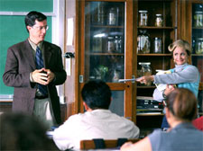 Where is Florrie Fisher today, the woman who inspired the character? Sedaris: I don't think she's alive Dinello: We have people out there with feelers, looking for her. She'd be... let's see, that was forty years ago, who's good at math? I think she'd be in her 80's now and when you do heroin for thirty years, that's not looking so good. Sedaris: Don't you actually look young if you do heroin? Dinello: Right. I guess our message is that it's good to do heroin if you want to maintain a youthful appearance. Keith Richards looks so spring fresh... Sedaris: People would say my skin looked to good to play Jerri and I would say, 'Heroin addicts have good skin I think.' I haven't done heroin or anything. Were you popular in high school? Sedaris: I got along with everybody. I was in a lot of clubs... I was a girl scout through my senior year, I was in Junior Achievement. Alright, I ran for Class Council and won. Dinello: How about Prom Queen? Sedaris: No, never. None of us really remember that much from high school. Dinello: They were dark years... Sedaris: I think that's one thing that's so funny about 'Strangers,' we're so un-hip. We don't know what the kids are like today, we didn't research it. We just did what we thought was funny. Dinello: We tried to create sort of a parallel universe, so we're not really commenting on real high school kids. It's our perception of what high school is like. Sedaris: With the teachers, I remember I always wondered what went on in the Teacher's Lounge. In the movie, I had one day off and I asked Paul if I could be an extra in a scene, to I play the bartender in the Teacher's Lounge scene. I had my eyebrows removed... that was fun. Have you been to your high school reunion? Sedaris: I've never even been invited. I was popular, did I answer that question? I've never been invited, I don't know why. I was in the phone book until about five years ago. Where are you from in North Carolina? Sedaris: The capital, Rawley. [Another reporter comments that he used to live there when he worked for the News-Observer] I used to deliver the News-Observer. I had my own newspaper route but I had to quit because one day the bag came up and flipped around my neck and it was icy out and I fell and that was it. What happened with Warner Independent, not following through with distribution? Dinello: They bought the movie at Sundance and then I went to LA and sort of worked on it with them and then the claimed at one point there was a clearance problem and they asked us to clear like eight thousand things in the movie, it became impossible so it was a separating of ways. Is it the same movie from Sundance? Dinello: The Sundance version was a rough version. The film wasn't really finished and I submitted a rough edit and it got accepted so I sort of put something together to show at Sundance, but it was never really the finished product. I watched it with all of the audiences there and it was clear it was a little too long. Is there anything that didn't make it into the movie? Dinello: There's great stuff that didn't make it in. Sedaris: Will that be on the DVD? Dinello: No. You'll have to come to my house to see it. You're all invited. But there's great stuff. There's a scene in a locker room with Amy where she's leering at cheerleaders... there's a scene where Matthew and Sarah, they're characters hook-up at the end. There's a scene where Sarah councils a teenager who's suicidal because his relationship broke-up, there's a lot of great stuff. Sedaris: So will that be on the DVD? Dinello: Yeah, it will all be on there. Do you see these characters taking on lives of their own, in spin-offs? Dinello: We think of it like The Jefferson's. Everyone gets their own show. Who would be your first choice for a spin-off? Dinello: I'd like to see Puffybush... Sedaris: I was just going to say the same thing! Dolores Duffy, who plays Mrs. Puffybush, I would have her... yeah, she's sixteen. She'd be great at a Sweet Sixteen. Is Stephen a good kisser? Sedaris: Yeah Paul, is he? Don't ask me,.. Dinello: He's a generous lover. He's a lot more refined than I am. I think I'm a little too eager. He does special things for you? Dinello: He does. He always has. Sedaris: Rrrrimming! Did the movie give you the freedom to do things you couldn't do with the TV show? Is there more swearing? Dinello: I think there's probably less swearing... Sedaris: Yeah, now that we can do stuff, we didn't. But we really didn't go out of our way to shock anybody, even the TV show. We did what we thought was funny. Dinello: Content-wise, I'd say that that's a whole lot different. I tried to give it a cinematic quality, and we could have set pieces that were more elaborate. When we were shooting the show, we had $18 so we had to write scenes around a classroom and a bathroom, which helped creatively in a way because you were really limited. So I hope that the film feels cinematic... Was there anything you learned from directing? Dinello: She's [Sedaris] a prima-donna, I didn't know that. The biggest difference is that there were people lined up to ask me questions about every little detail, 'Should Jeri's shoe be tied with a double-knot or a bow?' I thought people made those decisions on their own but apparently not. So that was different, that every detail or question had to be run through me. But it was sort of a natural progression, because we had so much control on the TV show, to ease into directing the movie. Everything I read has the three of you sort of equal partners. As the director you become 'The Boss'