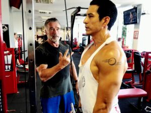 He’s a disciple of Arnold and he worships Arnold as all bodybuilders probably do. He has this amazing facility where I was able to train and get started growing like a weed. I was eating so much food and lifting heavy heavy, and I put on about 15 pounds overall in the end. Then of course, Arnold Schwarzenegger arrived sometime in July of 2018 and he started the ultimate motivation because I’m there training my ass off because I look across the gym and there is Arnold looking at me and says, ‘Let’s throw another 5 (pounds) on this and let’s get it up.”