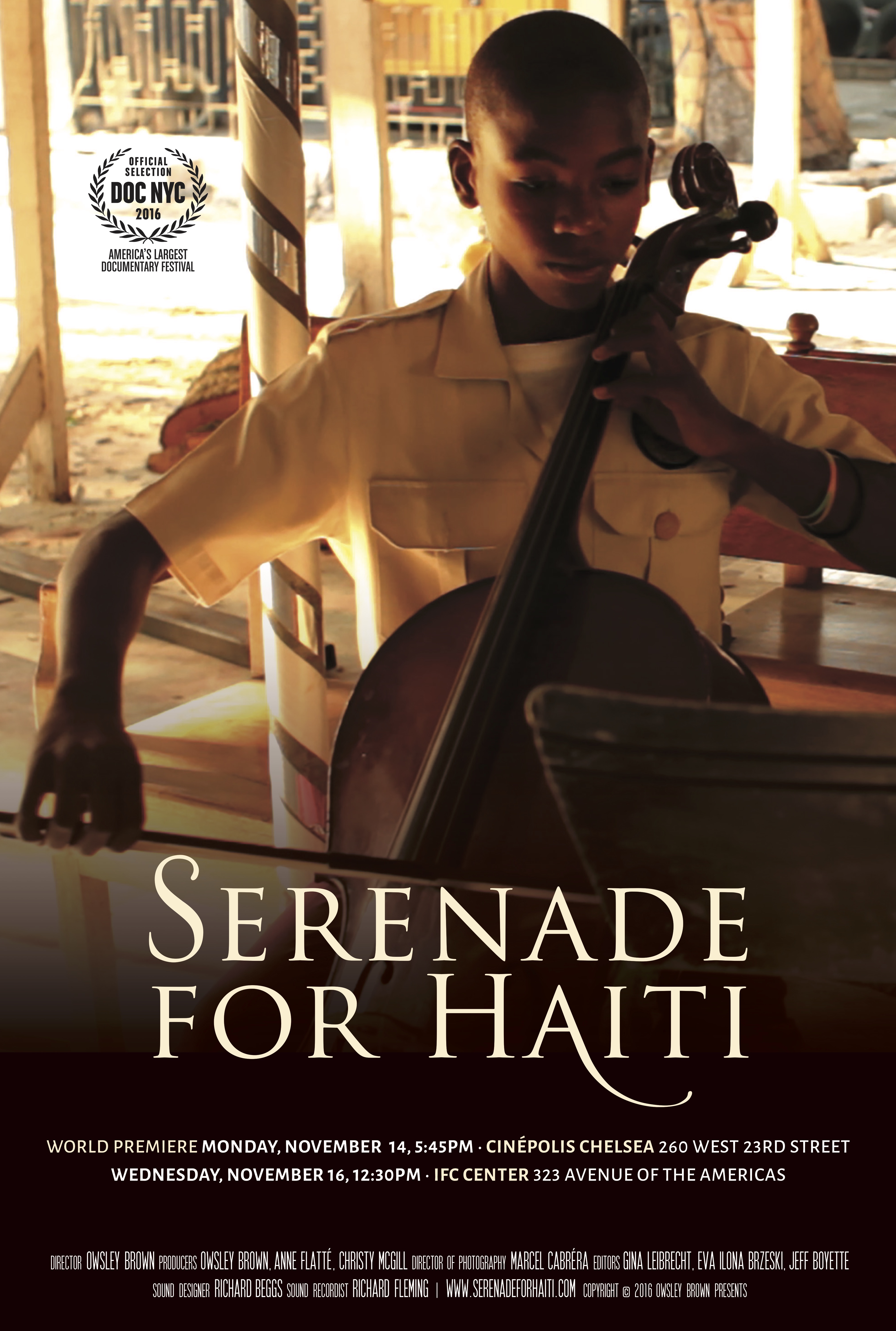 Owsley Brown’s third feature documentary, SERENADE FOR HAITI, will have its World Premiere at the 2016 DOC NYC Festival on Monday, November 14, @5:45pm at CINÉPOLIS CHELSEA, 260 West 23rd St. (east of 8th Ave.), screening again on Wednesday, November 16, @12:30pm at IFC CENTER, 323 6th Ave. (@West 3rd St.).